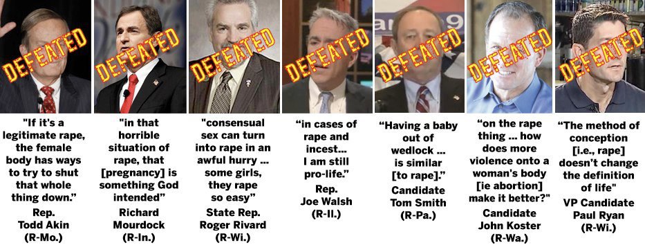 The last six months, maybe even the last year, has seen a steady drip of conservative white men saying really, really stupid things about rape and the pregnancies that are sometimes a result of that rape, things they appear to genuinely believe and feel called by their consciences to do something about. Last night, they got their electoral asses handed to them.